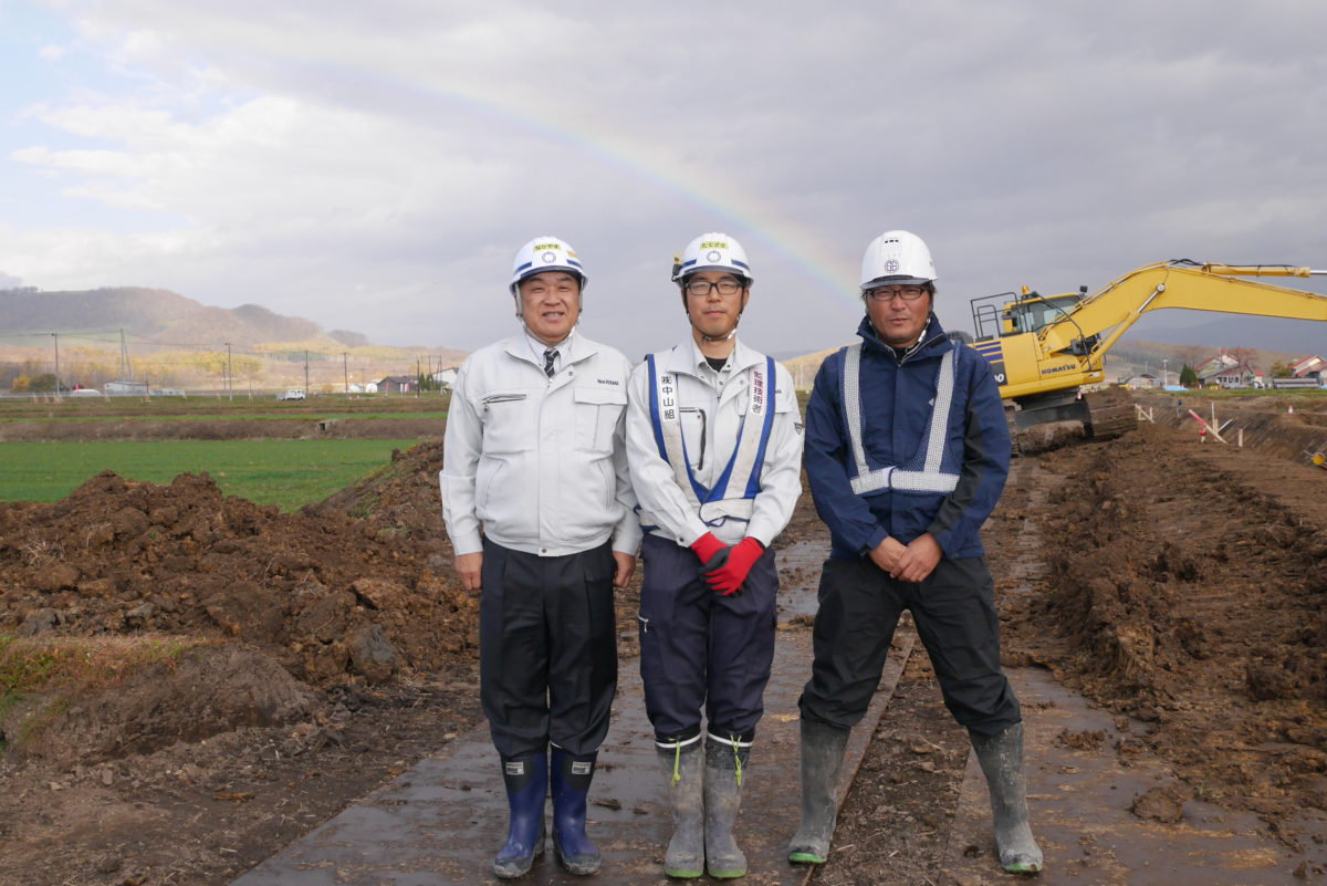 次の現場は「深川東岩山西入用排水」の現場になります。こちらの現場は遠藤組さんとのJVの現場になります。現場に向かう道中雨が降ってきたのですが、元和Bにつくと雨は上がり中山社長と舘崎さん、遠藤組の一安さんと写真撮影をする際に虹がかかりました。