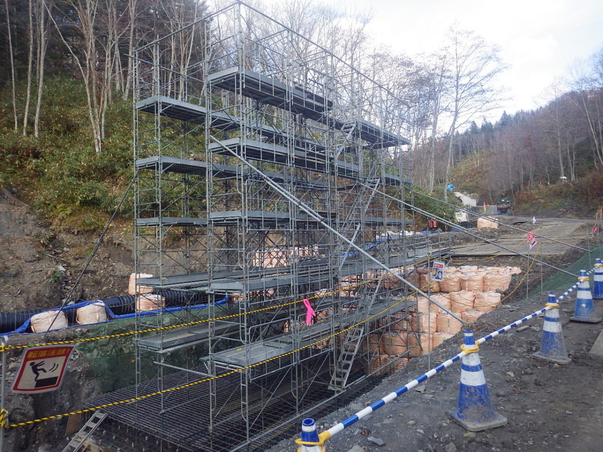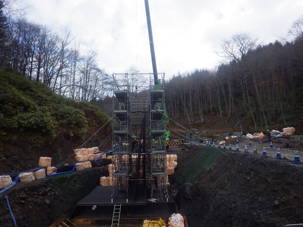 最初に向かった現場は「美唄富良野線擁壁工」の現場です。国道452号線の三段滝付近から山頂へ約11キロ入っていくと現場があります。その途中、まだ電気のついていない真っ暗なトンネルを通って現場に到着するのですが、トンネル内での事故は今まで無く、暗いため安全運転を心掛けているとのことでした。取材予定日前の大雨により、排水をしていたのですが、施工箇所の土嚢が崩れ足場が動いてしまったり、2回も水没したとのことです。擁壁の長さは110m、高さは13mの施工になります。取材時の進捗状況としては25%でした。雪も多い場所なので無事故で体調に気を付けて竣工を迎えてほしいと思います。お忙しい中ありがとうございました。