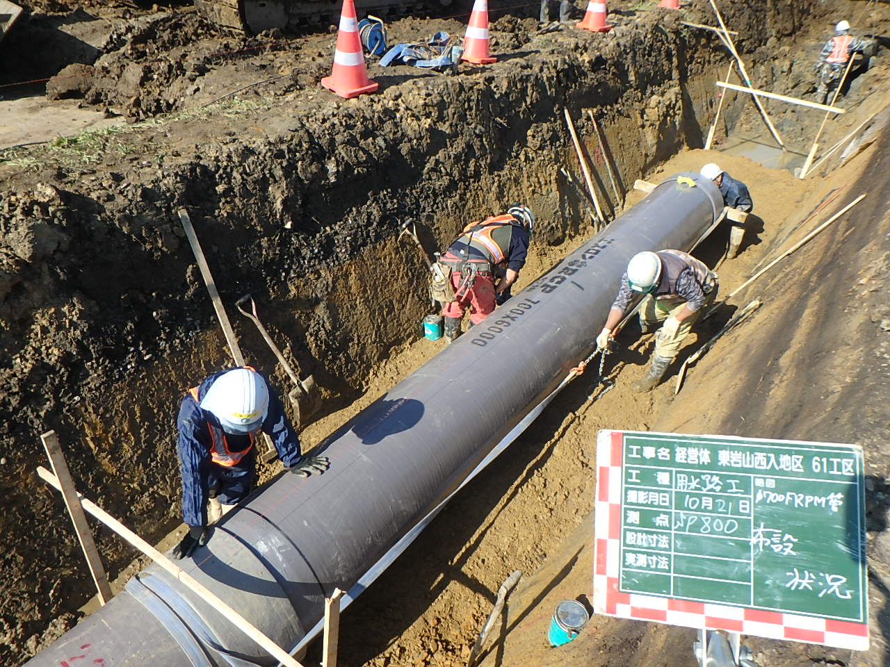 工事の内容は用水路の施工が842m、FRPM管がφ900~φ600で、大口径のため施工が大変とのことでした。排水路の施工は589m、V34・V30トラフで仮設ヤードが狭いため施工方法に工夫が必要だとおっしゃっていました。雨も多い時期で工事も大変そうでした。竣工まで無事故・無災害で頑張ってください。お忙しい中ご対応ありがとうございました。