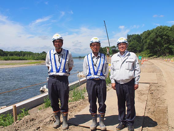 次に向かったのは深川市の「石狩川深川市災害復旧」の現場です。昨年8月に発生した台風による大雨の影響により4水系4河川で計画高水位を越えるなど北海道内では複数の河川において大きな出水となり、家屋や農地などが浸水する被害に遭いました。こちらはそのうちの石狩川水系石狩川での溢水により浸食した向陽橋下流の河岸部において、矢板護岸(281.51m)、根固めブロック設置などの護岸工事を行うことにより河岸を保護し、洪水に負けない「安全な堤防」をつくるための工事です。