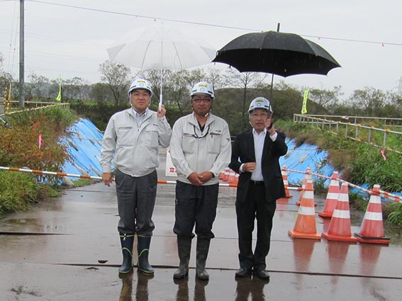 この現場は、釧路市内中心部からほど近いところにありました。この日は、朝から大雨の天候で残念ながら現場を見る事が出来ませんでした。共同企業体施工の現場なので事務所へ挨拶をし、事務所前で柳町君、熊谷道東営業所長と一緒に写真を撮ることしか出来ませんでした。なかなか大変な現場と言うことでしたが、安全と健康に気をつけるようにお願いし、次の現場へ向かいました。