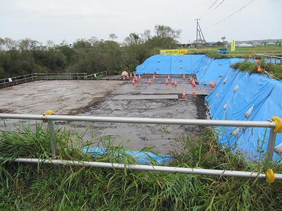 ここは日高町にある現場です。日高町内に入ると走っている車のほとんどが災害復旧関連の工事車両ばかりで、日勝峠手前にある現場事務所で三上所長と待ち合わせをして、簡単な説明を受けて現場へ向かいました。