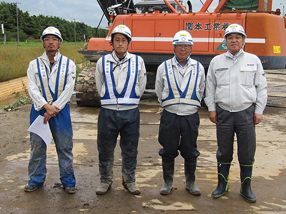 この現場は幕別町にありました。現場事務所に着き、佐藤所長、辻本君、地元出身の甲君と写真を撮り、現場の説明を受けました。