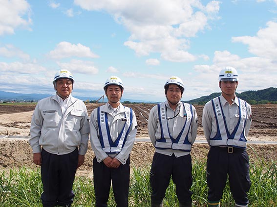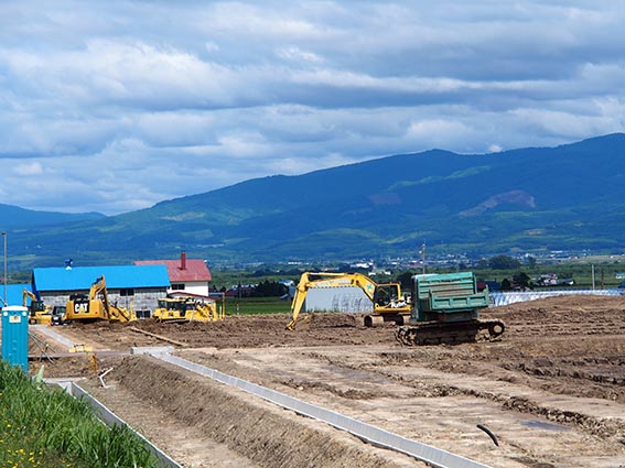現在の状況は、5月末より先行して行っていた整地工が完了し、7月末より予定されている暗渠排水工の段取りや現地での測量を行っているそうです。メインとなる用水路工は、計1,705mを順次施工しながら揚水機場に着手しますが、例年雨天の多い秋から真冬にかけて施工するため、天候等の影響により工程の調整が難しいと予想されるとのことでした。