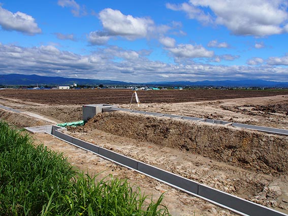 こちらの工事は新十津川町新北部地区の区画整理及び農業用用排水施設整備を行う工事です。 内容は、整地工2.2ha、暗渠排水工10.2ha、用水路工1,705m、排水路工340mで、用水路工では、開水路、管水路の施工の他、揚水機場や、PHC杭を基礎とする掛樋(用水路が排水路を横断するための水路橋)といった構造物の施工もあります。