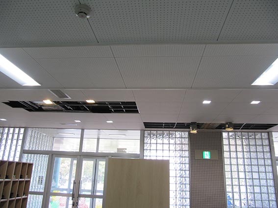 昨年11月から校舎外壁の改修を始め、屋上の防水工事、校舎の中は終わった箇所から引き渡し、また次の補修箇所へ移動するといった状態をこれまでに7~8回行ってきたそうです。また、学校が休みの土日にしか工事が行えない箇所も多く中々休みが取れない状況や、別途工事の暖房天井裏配管工事の為に、当社が撤去・復旧作業を行う箇所が至る所にあり、職人さん不足もあって日程調整に苦労されているとの事でした。