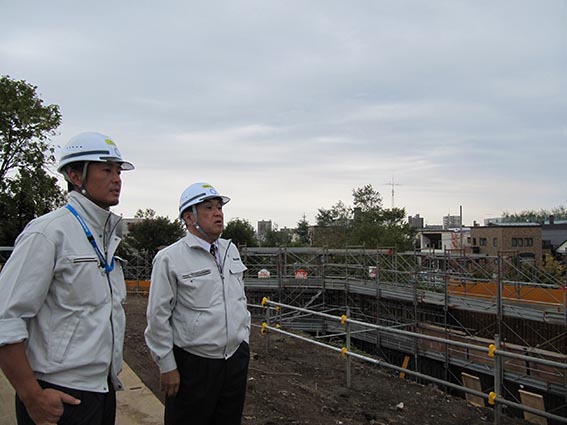 訪問時は擁壁工と下水道工が行われていました。土地に高低差があり擁壁は最大高さで4.59メートル、161メートルの長さがあります。今後は年内に路盤工事まで終了させ4月の雪解けを待って工事を再開する予定との事でした。