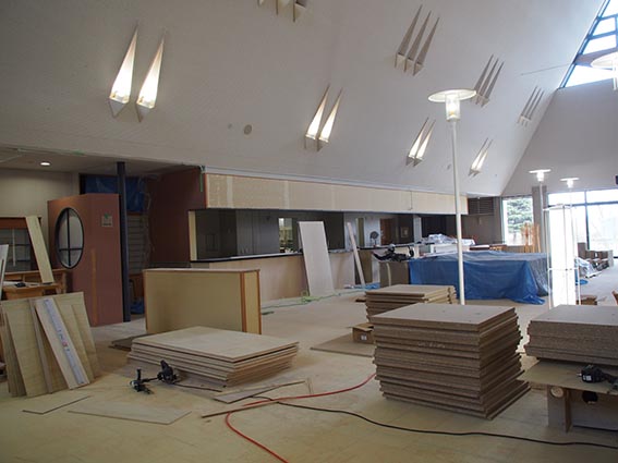 この工事は工期が2ヶ月と短く、そのうえ最初の1ヶ月間は営業しながらの改修で、夜間や仮設間仕切りを設置して区分けしながらの作業となり、昨今の作業員不足のなか厳しい工期で作業員の確保や制作物の納期確保に大変苦労されたそうです。また、建設当時の設計図データがほとんど無く、現地で測りながら施工図を描くのに時間を費やしたそうです。