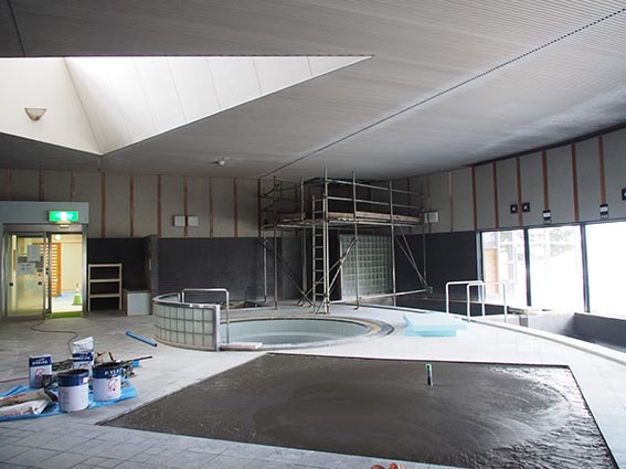 現場へ向かうと作業が急ピッチで進められていました。今回の改修では飲食コーナーやドリンクコーナー・フロント周り・事務室・休憩所のリニューアルと、浴槽の撤去・休憩スペースの設置・サウナの改修や露天風呂の改修を行います。改修後は男女の浴室が以前とは反対になり、女性の方には脱衣所からそのまま入れる岩盤浴室が新たに設置されるそうです。オープンは12月1日の予定となっています。