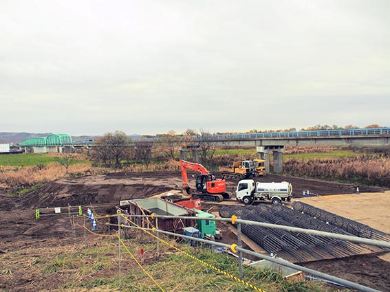 築堤開削前に腹付盛土を終わらせなければならなかったそうですが、他工区と施工箇所が重複する箇所があり、そのため一時中断を免れず、一部施工が秋になってしまいましたが、工程を調整しつつ、完了するために尽力したそうです。また、築堤上にサイクリングロードがあり、通行可能のまま施工をしなければならなかったため、施工範囲の明示・立入禁止措置や交通誘導員を配置するなど、地域の方々への注意喚起を行いながら、安全対策に配慮されたそうです。