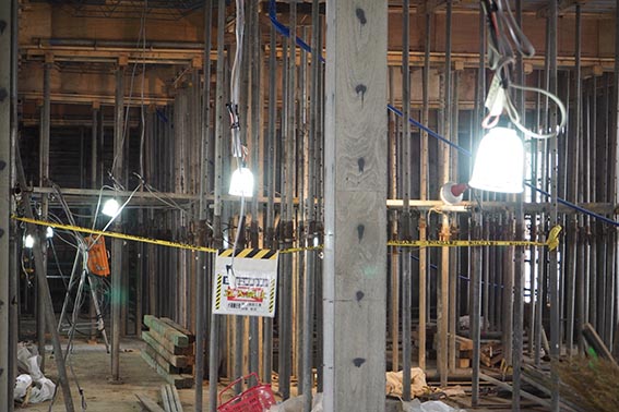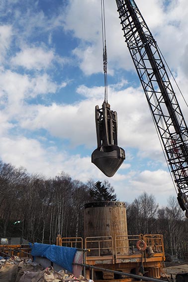 現場を訪れたときには杭工事を行っており、建築の現場では見かけることはあまりないような大きさ、太さ、長さの場所打杭を施工していました。この杭はケーシングを使い掘削して鉄筋を建込み、コンクリートを打設するCD工法です。中間層からとても硬く、転石も多いため掘るのも一苦労とのことです。また杭打設完了までに1本あたり2.4日もかかります。訪問時は全部で40本中32本が施工済みで、全体の進捗率は6%程ですが、杭工事だけでみると80%完了していました。12月中旬に杭工事を終え、山留工事の作業も年内終了予定です。