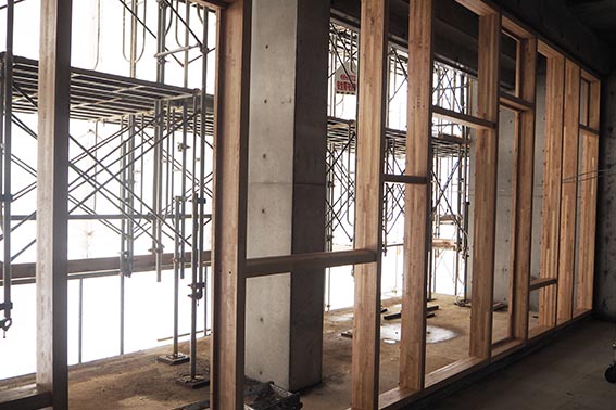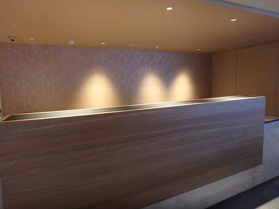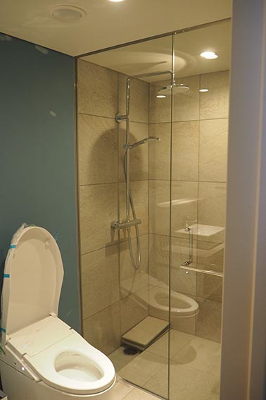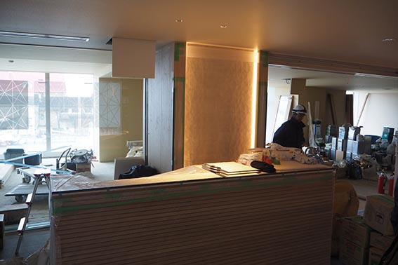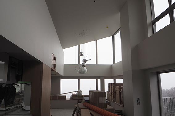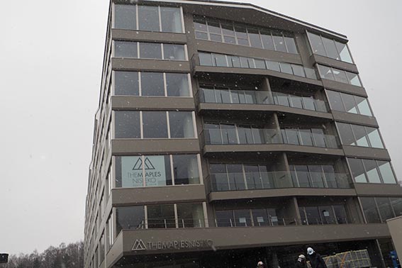 現場の周りには高級ホテルやコンドミニアムが建てられており、施工中のものも多くあります。訪問時には、検査で指摘された部分の是正や、6Fの床や照明等の仕上げ工事が急ピッチで行われていました。メイプル新築は本館とつながっている別棟がニセコグランヒラフスキー場のゲレンデとつながっており、スキーイン、スキーアウトができる作りになっています。住戸内の家具は旭川家具メーカーのカンディハウスのものがこれから搬入、取り付けになるのでより高級感が増すように思われます。床はすべてカーペットになっていたり、シャワールームもユニットバスではなく、ユニットシャワーになっていたりと外国の方の生活を考慮した、観光客目線の作りになっていました。