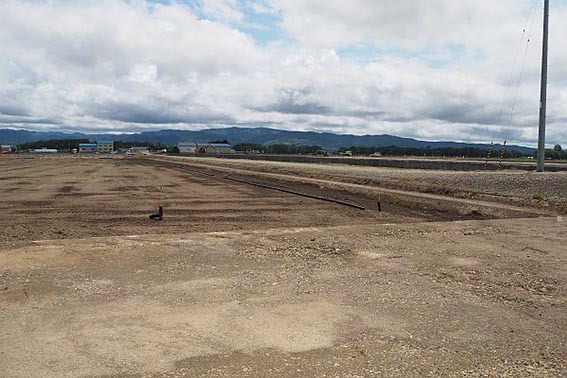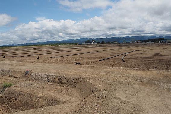 最初に訪れたのは「美唄103東他工区ほ場」の現場です。こちらの現場は約30haの土地で整地工と暗渠排水工を行うほか、農道工、用水路・排水路工が行われています。現場は3ブロックに分かれており整地工、暗渠排水工と順番に施工を進められているそうで、暗渠はインタードレーンを使用し人が中に入らずに作業できるそうです。川が近いため液状化対策に苦労されているとのことでした。