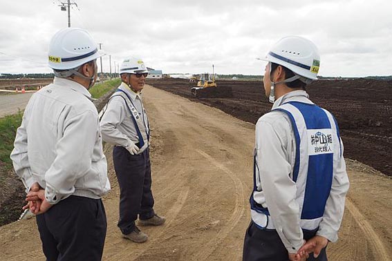 次に訪れたのは「美唄132・133工区ほ場」の現場です。先ほどの「美唄118・119工区ほ場」とは隣接した位置にある現場です。施工している面積は26.5haと1、2番目に訪問した工事と比べると小さいですが、全面に客土工が行われるとのことでした。現場では全長170mの暗渠が完了している様子を見ることができました。安全に竣工を迎えられるよう頑張ってください。お忙しい中丁寧に対応していただきありがとうございました。