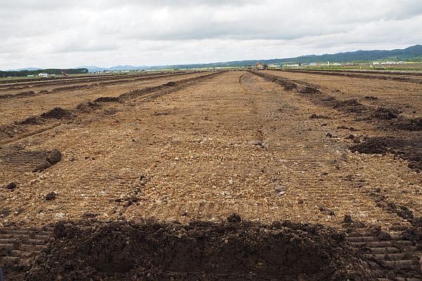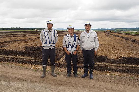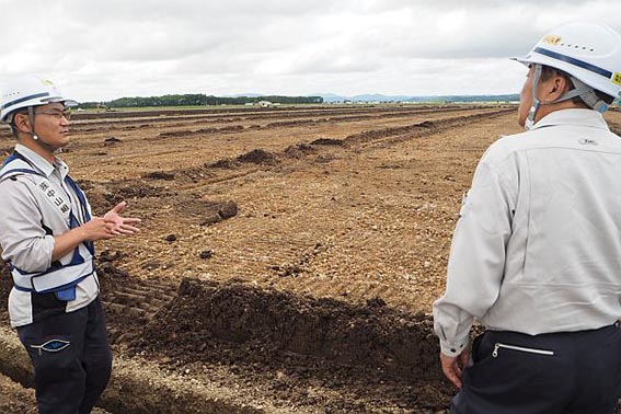 2番目に訪れたのは「美唄118・119工区ほ場」の現場です。こちらの現場は整地工・暗渠排水工・客土工、農道工のほか、用水路・排水路工を合計5.0km施工している現場です。訪問日は整地の最終日とのことでした。
