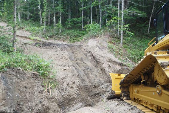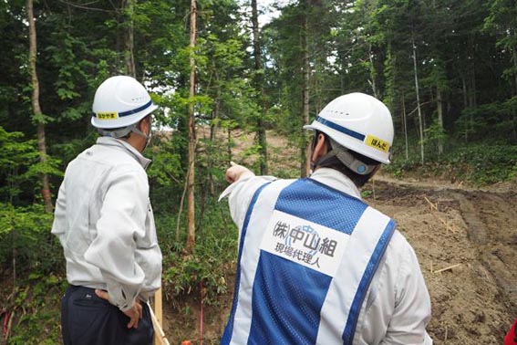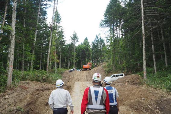 こちらは桂沢ダムの嵩上げに伴う地すべり対策の工事で、付替林道、掘削、押え盛土の工事が行われるそうです。既設の林道とぶつかるまで800m伐開後、林道を造成していくそうで、道路幅が3mで車輌がすれ違えず苦労されているとのことでした。現場では熊が出没したことがあったそうで、鈴や熊スプレーを携帯し対策しているとのことでした。安全に竣工を迎えられるよう引き続き頑張ってください。お忙しい中ご対応ありがとうございました。