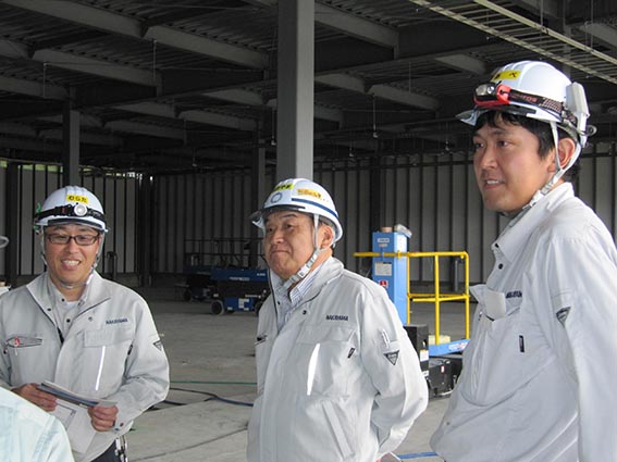 ここは、北見市豊地地区の工業団地内に事務所と倉庫を新築している現場です。地元の鐘ヶ江建設さんと共同企業体で工事を進めていました。10月末の竣工を目指して村田所長、阿部君から説明を受けました。