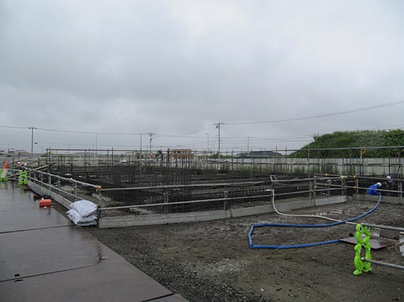 この現場は、工事場所が釧路西港第4埠頭の工業団地内で、既存のマテック釧路営業所の「古紙圧縮梱包工場」の施工になります。鉄骨2F建で基礎工事の真最中でした。