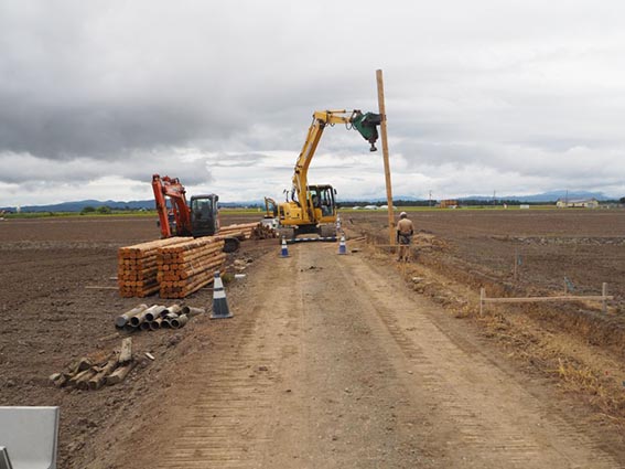 最初に訪れたのは「R2岩見沢西川南ほ場」の現場です。こちらの現場は水田地帯の区画整理の整地工、暗渠排水工のほか、用水路工、排水路工を行っている現場です。水田の落水を待ってから本格的に施工が始まったとのことで、見せていただいた施工箇所では暗渠の工事までが終わり用水路工を行っており、この日は用水路に木杭を打ち込む作業が行われていました。また、暗渠のパイプに貯水をする地下灌漑の設備の施工の様子も見ることができました。