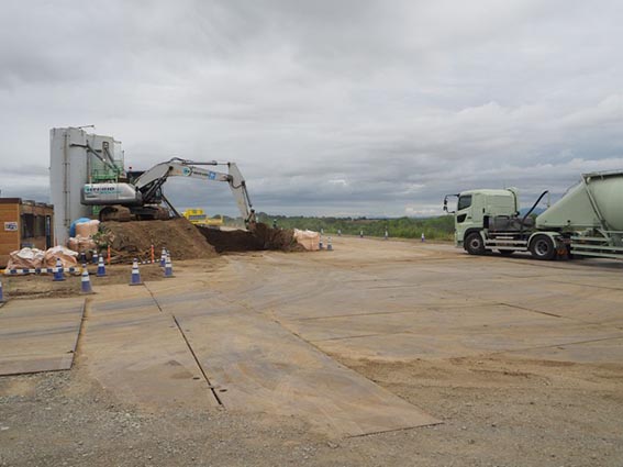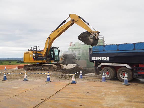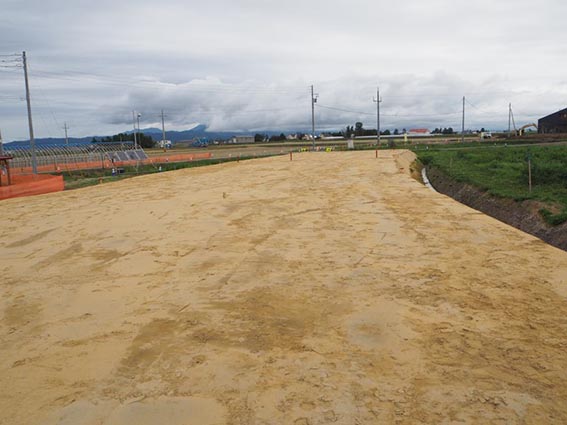 次に訪れたのは「北村3区撹拌土造成」の現場です。こちらの現場は「たっぷ大橋撹拌土造成」の工事と同様に、北村遊水地事業の旧美唄川囲ぎょう堤に必要な盛土材の撹拌土造成を行っている工事です。通常は、軟弱地盤の場合砂質土と粘性土を混ぜて盛土材に使用するところ、「北村3区撹拌土造成」「たっぷ大橋撹拌土造成」の現場では、砂質土の供給が難しいためセメントと現地粘性土を攪拌して造成を行っているそうで、この方法は非常に珍しいとのことでした。