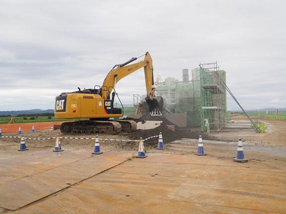 次に訪れたのは「旧美唄川囲ぎょう堤」の現場です。こちらの現場は北村遊水地事業における囲ぎょう堤として既存の堤体断面を大きくするために、築堤盛土を行っている工事です。盛土層数の21層のうち、この日は9層目の作業をしていました。希少生物であるオジロワシ生育環境保護の影響で工事の着手が遅れたことと、工事箇所に隣接する水田への影響に配慮しながらの施工に苦労されているとのことでした。