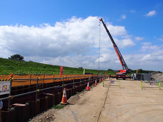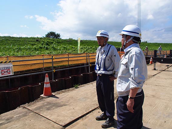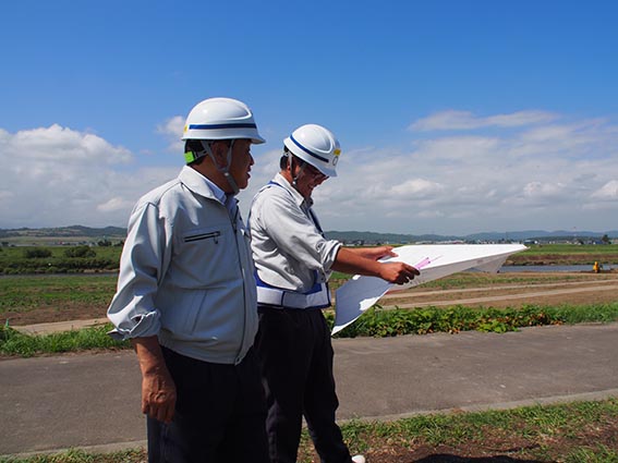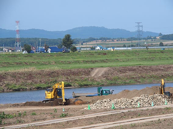 次の現場は、先ほどの頭首工の現場から1kmほど移動したところにある「雨竜川八丁目導水路」です。こちらの現場は、国営総合農地防災事業雨竜川下流地区の事業計画に基づいて、八丁目頭首工導水路の整備を行うものです。新設される頭首工(当社施工)が既存位置より雨竜川の上流側に建設されるため、頭首工より取水された農業用用水を下流側へ流下させる導水路の施工を行っています。河川環境を改善し、正常な機能の維持と増進を図ることで、農業用水を安定的に供給することができます。