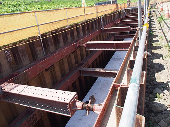 鋼矢板と切梁・腹起しにて土留・仮締切を行いながら掘削しており、掘削深さが6m程度あり重機オペレーターからは施工箇所が見えないため、無線機やモバイルカメラ等を用いてやりとりをしながら重機災害の防止に努めているそうです。また、プレキャストカルバート(B=1.5m H=1.5m L=2.0m)1函の重量が5.2tもあるため、吊荷作業時には上記と同様に無線機やモバイルカメラ等の通信システムを使い、周りと連携を取りながらクレーン・吊荷災害の防止に取り組んでいるとのことでした。