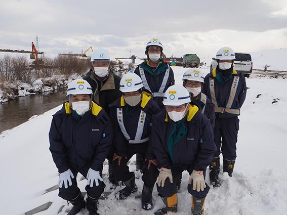 最初に向かった現場は、「利根別川広域河川改修」の現場になります。こちらの現場は、洪水対策として川の拡幅工事を行っています。施工箇所が3工区に分かれている点や、住宅地付近での作業、元々の川幅が狭く重機を入れるのが大変など施工するに当たり苦労する点が多くあるとのことでした。施工地が岩見沢ということもあり、積雪量も多く、さらに、工期終盤の追い込み期での雨で雪が溶けてしまい、川の水位が上がってしまうなど天候面においても大変な現場でした。これから竣工に向けラストスパートに入っていきますが天候面はもちろんのこと、雪が溶けての事故などがないよう工事を終えてほしいと思います。お忙しい中、対応していただきありがとうございました。