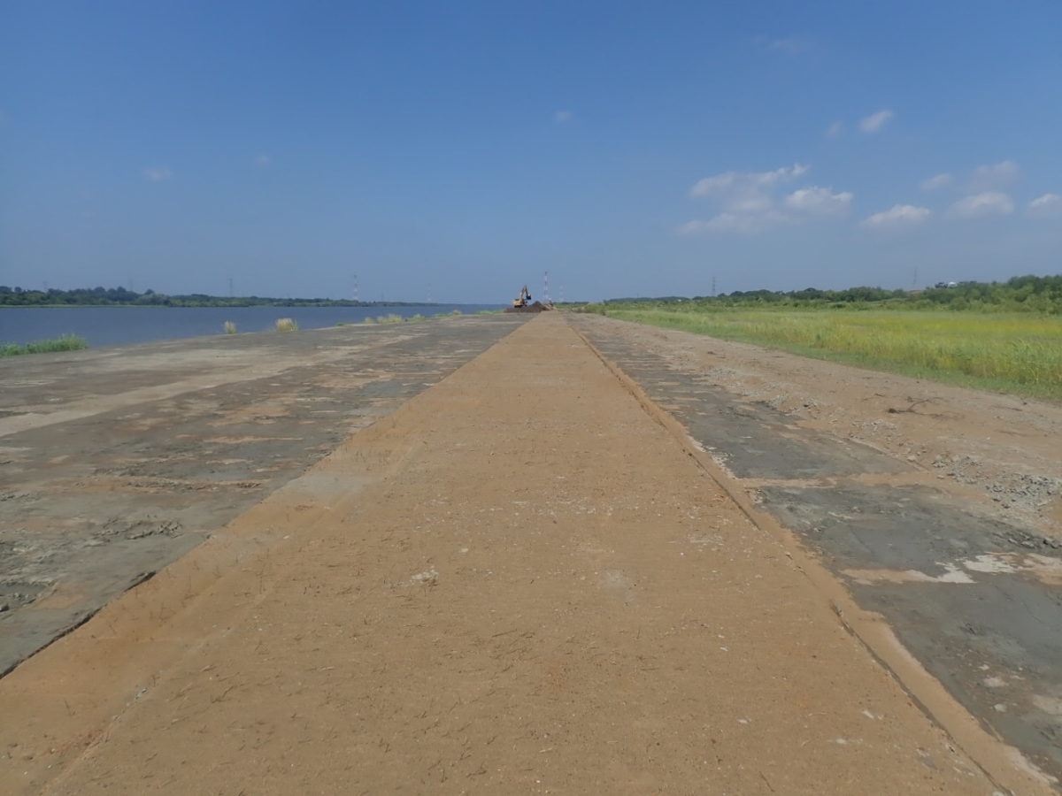 昨年9月に視察で訪れた際には、流入水路の施工が行われていましたが、今回の視察時には新たな樋門が完成していました。古い樋門は既に撤去が完了していましたが、構造物の一部が川の中に位置するため、矢板で締切をしてからの撤去となったそうです。現在は築堤盛土の施工が行われています。