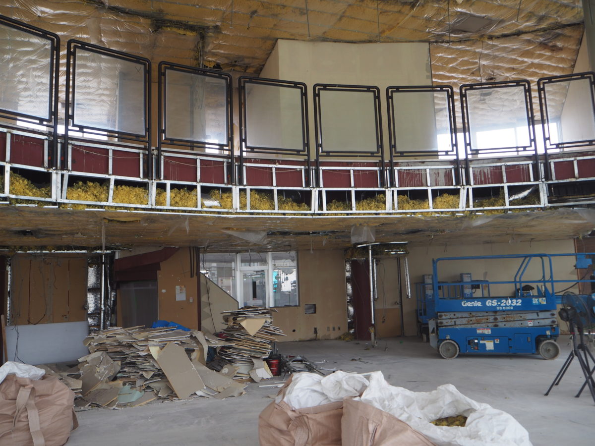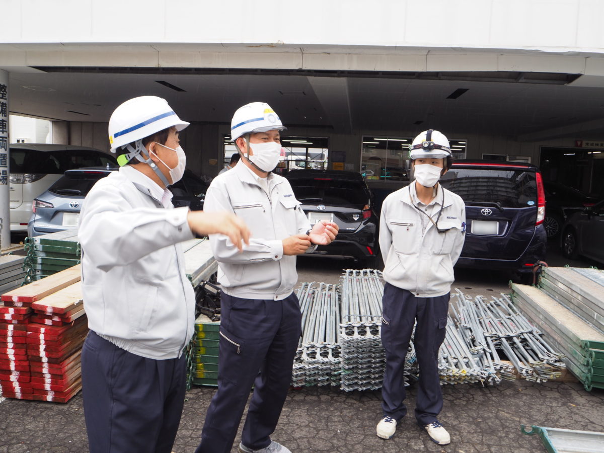 続いて向かったのは「トヨタ二十四軒店」の現場です。こちらの現場は、トヨタカローラ二十四軒店の社屋改修と隣接する工場の新築工事を行っています。視察当日は、工場の新築工事を引渡しは既に完了しており、社屋の天井ボードの解体作業が行われていました。現場周辺は非常に交通量が多く、一般車両の通行制限をかけながら安全に留意して工事車両の出入りや資材搬入を行う必要があり、苦労されているとのことでした。