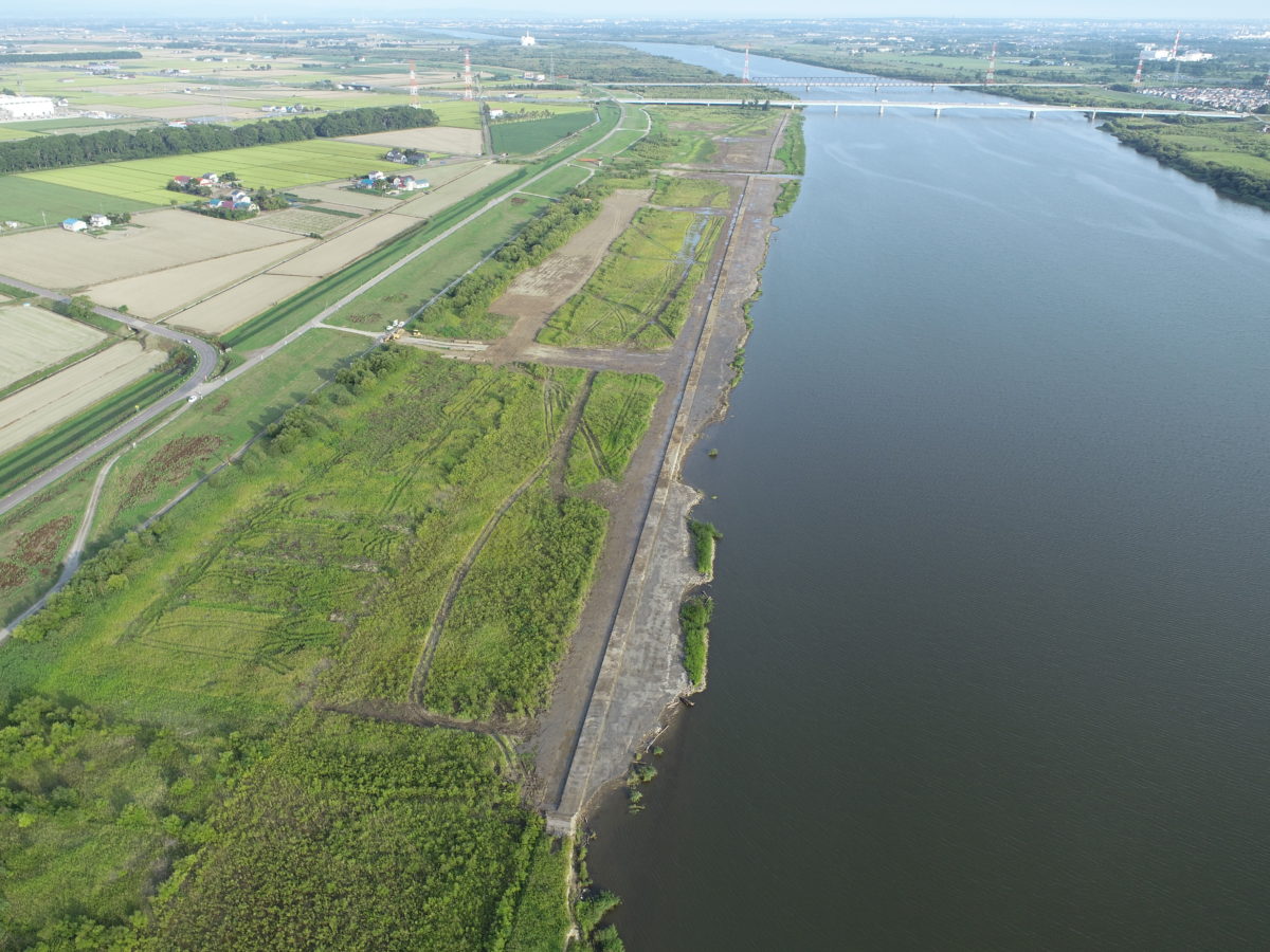続いて向かったのは、「美登位築堤河道掘削外」の現場です。こちらの現場では、洪水時に川が氾濫しないよう、川沿いの土を掘ることで水が流れる面積を広くする工事を行っています。掘り出された土砂は千歳市・恵庭市の遊水地内で他工事により攪拌後、堤防等の盛土材として使用されるとのことで、6月中旬から8月中旬にかけて大多数のダンプトラックによる長距離運搬を行い、現在は掘削・土砂運搬工事がほぼ完了していました。