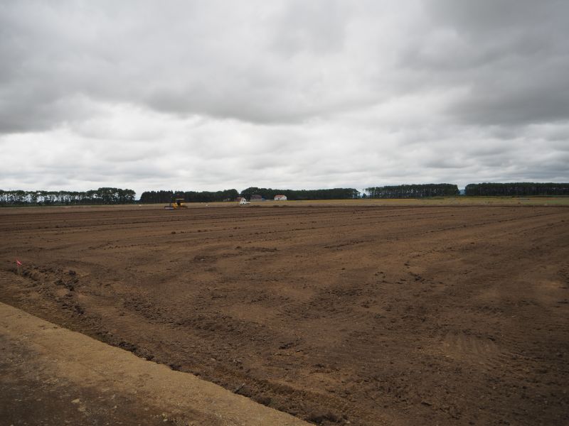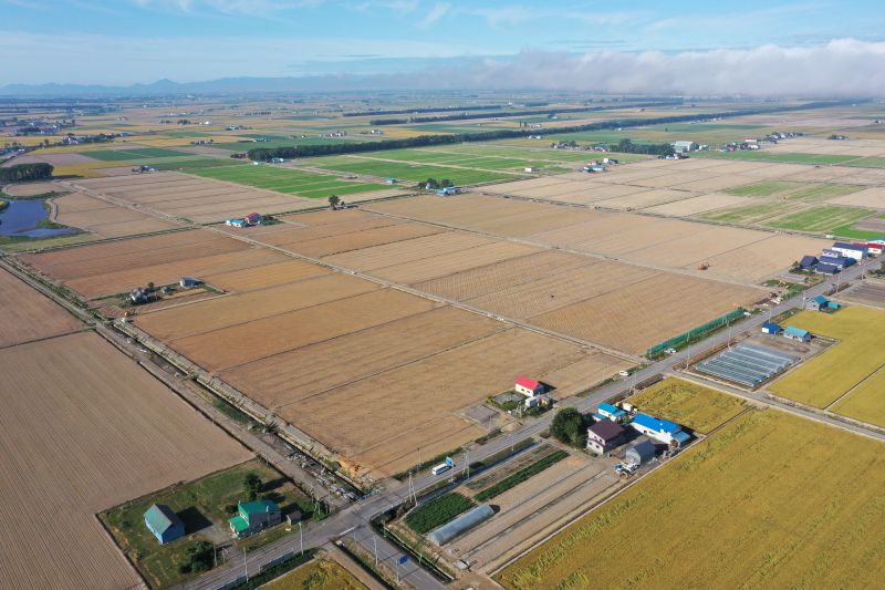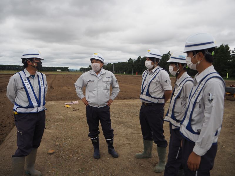 初めに訪問した現場は「美唄166・167工区ほ場」です。こちらの現場では、訪問時には整地工が終わり、暗渠排水路工がメインで行われていました。天候に恵まれたおかげか、工事は順調に進んでいるそうです。面工事はほとんど終了し、8月末の引き渡しに向けて作業をされていました。ほかには農道工、落水後に行う予定の用水路の施工、道路横断工、その他の細かな作業が残っているということです。