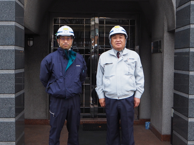 次に向かった現場は「セボーラ栄町修繕」です。こちらは、平成17年に当社で施工したマンションの外壁の修繕、バルコニーの塗装や床の防水作業、屋上の防水改修作業など、大規模な修繕工事を行う現場です。