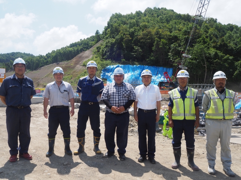 厚真町から離れ、続いて訪問したのは、「日高町パンケヌシ林道」の現場です。こちらは、雨により流されてしまった林道に、擁壁を立て復旧する工事になります。崩れた林道の下に日高町の水源があり、水源を避けるよう擁壁を施工していきます。山の奥にある現場事務所から、さらに細い道を奥に進んだところに現場がありました。現場に到着した時は掘削作業が行われており、間近で見せていただくことができました。林道の先へ行く道が他にないため、復旧した林道を心待ちにしている企業様もいるようです。また、中山社長が来るということで㈱笹田組の笹田社長様が現場に足を運んで下さり、ご歓談されていました。