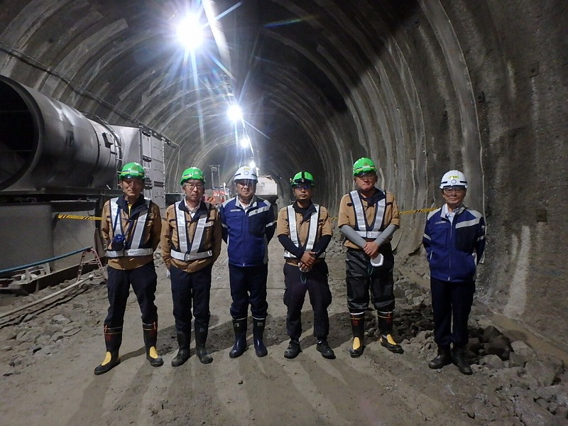 9月5日午後、中山社長の3日間 5現場~移動距離1,000㎞を超える視察の初日、待ち合わせの新得市街で鴻池組の高萩北海道支店長と水沼企業体所長にお出迎えを頂き、施工現場へ移動しました。途中ペンケオタソイ川の橋梁下部工施工箇所を通過し、十勝清水・占冠IC間の4車線化に伴う最初のトンネルとなる「広内トンネル」(L=910m)の東坑口詰所で全施工延長3.5㎞の工事概要・工程・安全対策の説明を受けたあと、トンネル坑内へ移動しました。現在の進行状況や問題点などの質問に、年内貫通を目指し無災害完工に向けた様々な工夫をしていることなど、丁寧な説明を受けました。