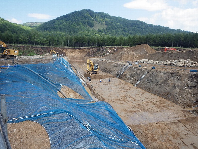 本河川は、2016年夏の台風で大きな被害を受けた日勝峠東側麓の北海道が管理する河川で、過年度より上流から4号・3号と一連の床固工等を実施している砂防工事で、今回の視察現場は左岸側2号床固工及び護床工・盛土工(今春別業者施工により右岸側半断面の床固工が完成済)を施工し2号床固工を完成させる工事で、概要としては床固提体H=7.0m、L=134.5m、生コンクリート打設V=4,405m3を打設する工事で、打設前の作業土工終了時点の視察となりましたが、工事規模の大きさに感心させられました。
