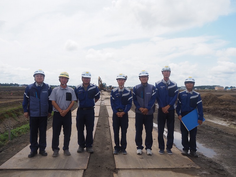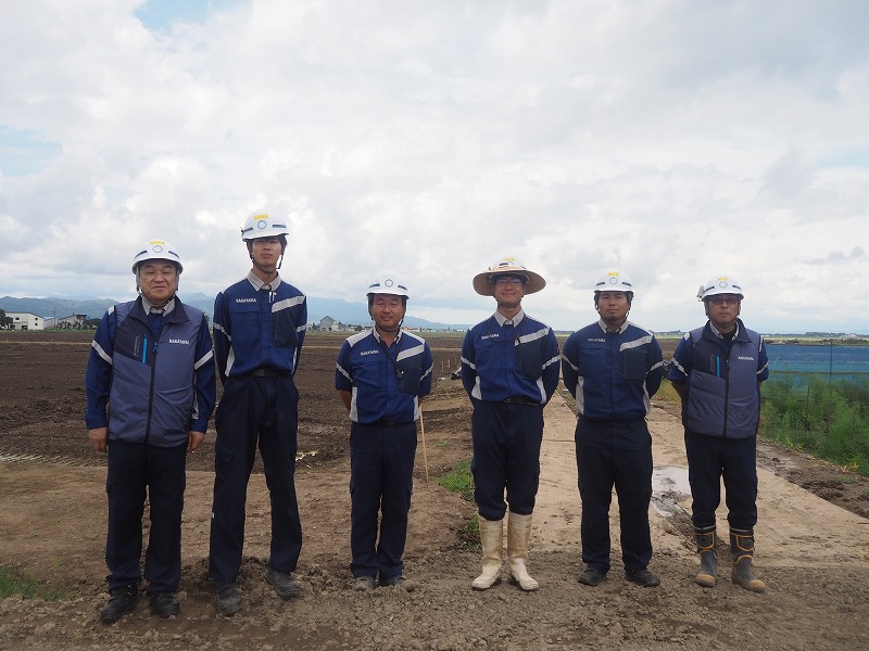 こちらの現場では共通して、整地工と暗渠排水工のほか、農道工、用・排水路工、管水路工が行われています。北村地区では、暗渠工という透水性のある管を地中へ埋設することで、地上や土中の水を集水、排水する工種が採用されています。そのため、トラフという農業用水路等にて利用されることの多いU字型の排水溝等の障害物がないので、将来的には無人の農業機械の導入も可能になるようです。やはり雨の影響は大きいようですが、進捗状況は3現場とも順調で、社長も気にかけていたお盆休みは安心してお休みできると伺いました。集合写真も合同で撮ることができたりと、中山社長と現場担当者の皆さんの会話も非常に盛り上がりました。