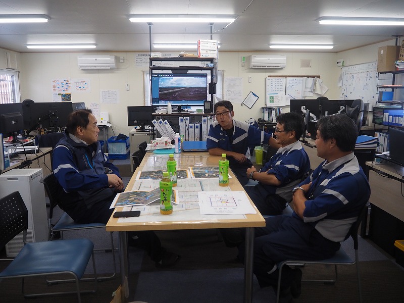 続いては、「北村豊正24区ほ場」の現場です。こちらの現場は同じ建物内の2階に「北村豊正23区ほ場」の現場事務所が設けられているため、一緒にお話を伺わせてもらいました。さらに、隣接している上記2現場に加えて「北村豊正26区ほ場」の3現場が隣接されているため、同時に視察させていただきました。