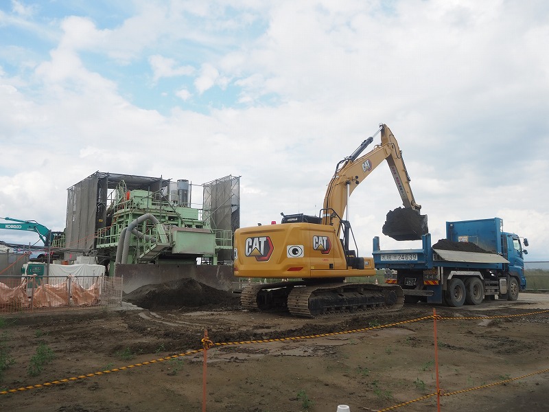 最後に向かったのは、北村築堤上流掘削外の現場です。こちらでは、石狩川河川流域の浸水被害の削減へ向けて、河川整備に必要な盛土材確保のため、回転式破砕混合工法にて攪拌土掘削土を土質改良し、築堤盛土材として製造する工事が行われています。当日も原料土が投入され、破砕、混合された攪拌土が積込・運搬されているところを見せていただくことができました。バックホーによって攪拌土が運搬用のトラックに正確に滞りなく積載される様子は、非常に効率的で力強い印象を受けました。