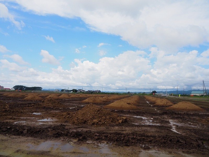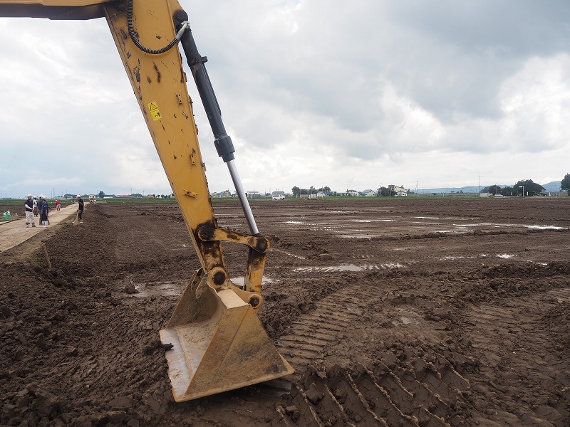 本社を出発して最初に訪れたのは、「美唄139工区ほ場」の現場です。まずは、現場事務所でお話を聞かせていただきました。こちらの現場は発注時期が遅く、段取りの準備期間がほぼない中で同時に現場を稼働させているため、時間の使い方に工夫が必要なようです。また、最近の雨天の影響や他の近隣の現場との調整もあり、工程管理に苦慮されていると伺いました。取材当日の前日も雨の影響を受けたため、水切り溝を作って排水を促しているところを見せていただきました。現場でお話を伺っていると、山下土建の山下社長様もお見えになり、中山社長とご歓談されていました。今後の予定として、8月末には7割引き渡しを完了させるということでしたので、天候にも恵まれ作業が計画どおり進められることを願っております。現場では伊藤所長、2年目の大石君に現場の進捗状況や様子について丁寧に説明していただきました。お忙しい中ご対応していただき、本当にありがとうございました。