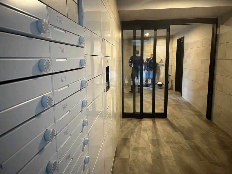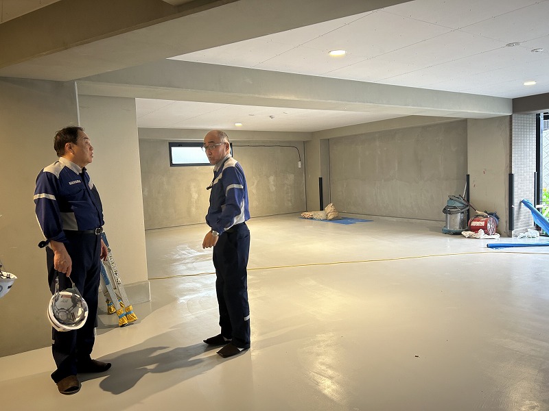 最後に向かったのは、「ルーヴル真駒内」の現場です。こちらの現場では、3LDK 6戸、2LDK 18戸の計 24戸からなる鉄筋コンクリート造7階建ての賃貸マンションを施工しています。発注者のこだわりがあらゆる場所に見受けられ、電気や金具、外壁のタイル等々細かな面までデザイン性に富んでいました。発注者の思いに応えるため苦労もあったと伺いましたが、中山社長も興味を示すデザインが随所に溢れる素敵な空間となっていました。車庫も見学させていただき、オートロック式で、24台駐車することができるそうです。