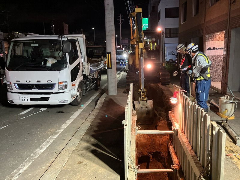施工場所は地下鉄の美園駅(札幌市営地下鉄東豊線)に近く交通量が多い場所です。3車線の道路のうち2車線を規制しなければならないため、交通量の少ない夜21時以降に作業を進めています。現在は、電気やガスの線、信号のケーブルなどを通すための管路工を行っています。また、電柱だけでなく街灯も撤去されて中央分離帯に設置されるため、歩道が広く通りやすくなるとのことでした。