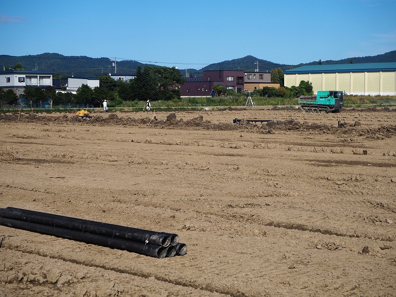 次に向かった現場は「R6長沼町新光西ほ場」になります。こちらの現場は整地工と暗渠排水工のほか、用・排水路工などを行っています。訪問時には、進捗率85%で今後は暗渠排水工、農道の敷砂利を行う予定です。こちらの現場も天気が良く、中山社長も工事が順調に進んでいることを確認し、安心しておりました。工期は11月末までとなっておりますが安全第一で作業を進めていってほしいと思います。お忙しい中、対応していただきありがとうございました。