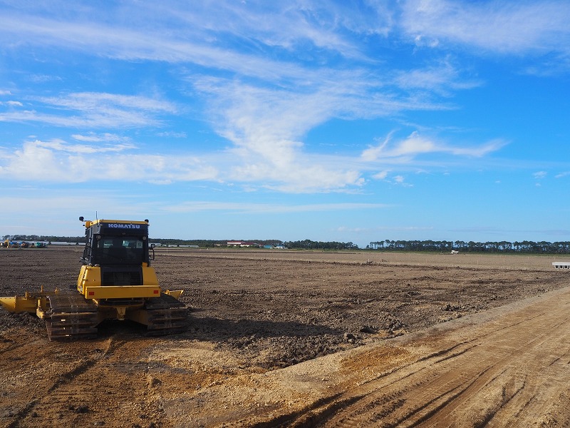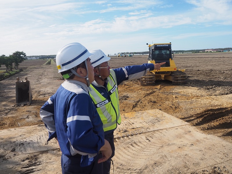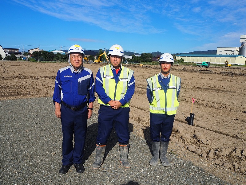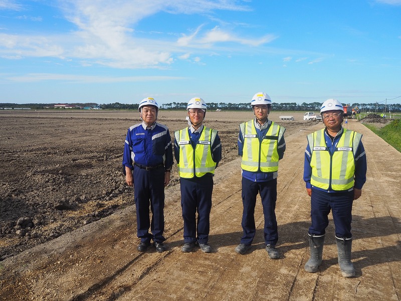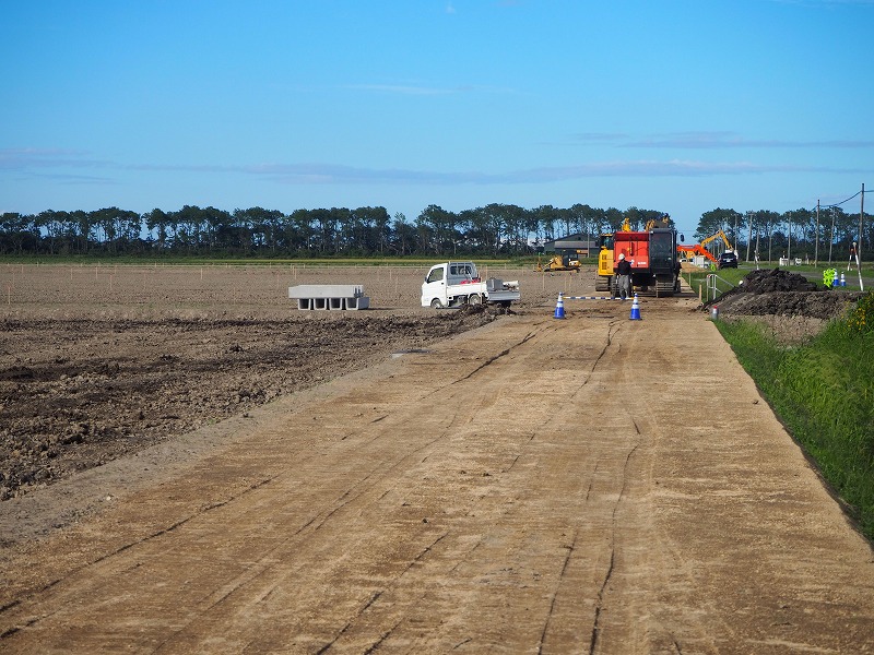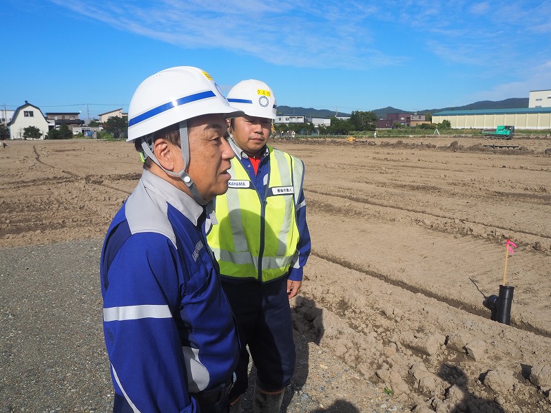 次に向かった現場は「長沼14区地区ほ場」になります。こちらの現場は整地工と暗渠排水工のほか、用・排水路工などを行っています。訪問時には、進捗率80%で用水排水路がすでに終わっている状況です。天気が良く順調に工事が進んでいます。現場は交通量が多い場所で社長はとても驚いておりました。工期は12月までとなっておりますが安全第一で作業を進めていってほしいと思います。お忙しい中、対応していただきありがとうございました。