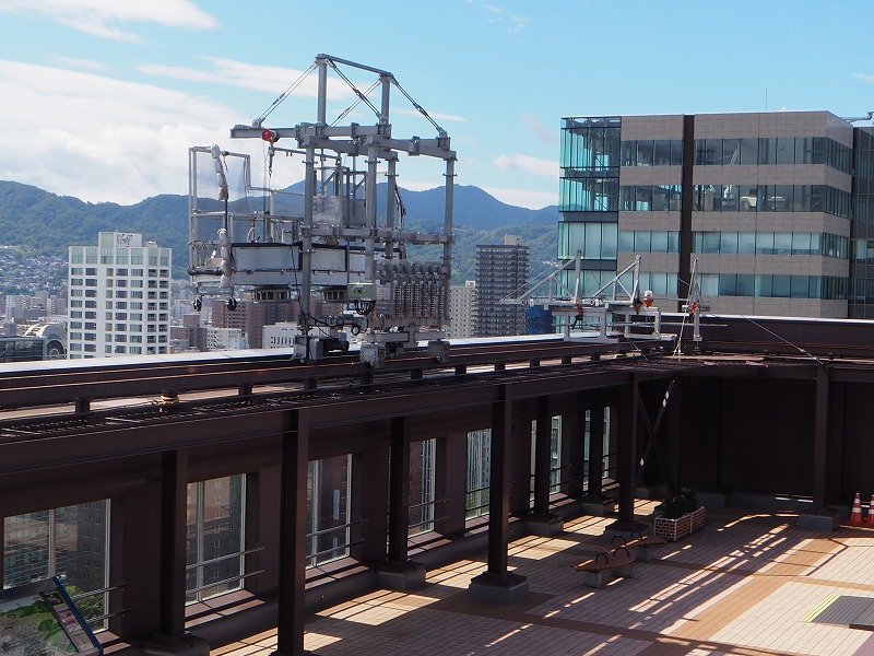 使用する仮設のゴンドラは300tクレーンで荷揚げをして屋上で組み立てたものと庁舎に既存されている1基を使用。