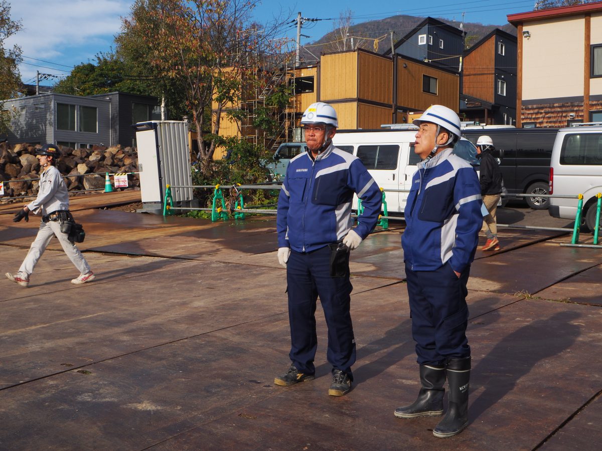 「AKIニセコ」の現場です。こちらの現場では、ヴィラと入居者専用のクラブハウス建設用に造成された15か所の宅地のうち、E宅地とH宅地の2か所でヴィラを建設しており、併せて受変電設備工事と温泉機械室の施工も予定しています。現在はE宅地を施工中で、視察時点での進捗は54%とのことでした。地上4階建てのヴィラは温泉、サウナといった高級コンドミニアムに引けを取らない充実した設備に加え、外観や内装にR加工と呼ばれる丸みを帯びた加工が施されており、現代的なデザインと子どもや年配の方でも安全に過ごすことができる空間を実現しています。今後、E宅地での建設は12月下旬からの工事自粛期間を迎えるまでにほぼ完了し、自粛期間明けの来年4月よりH宅地での施工が本格的に始まります。建設前の宅地に現場事務所を構えておりますが、当該箇所の購入者が決まると事務所を移動しなくてはならないそうで、現在の事務所も別の宅地から移動してきたというお話もお聞きすることが出来ました。現場担当者の皆さんにおかれましては、お忙しい中丁寧に対応いただきありがとうございました。