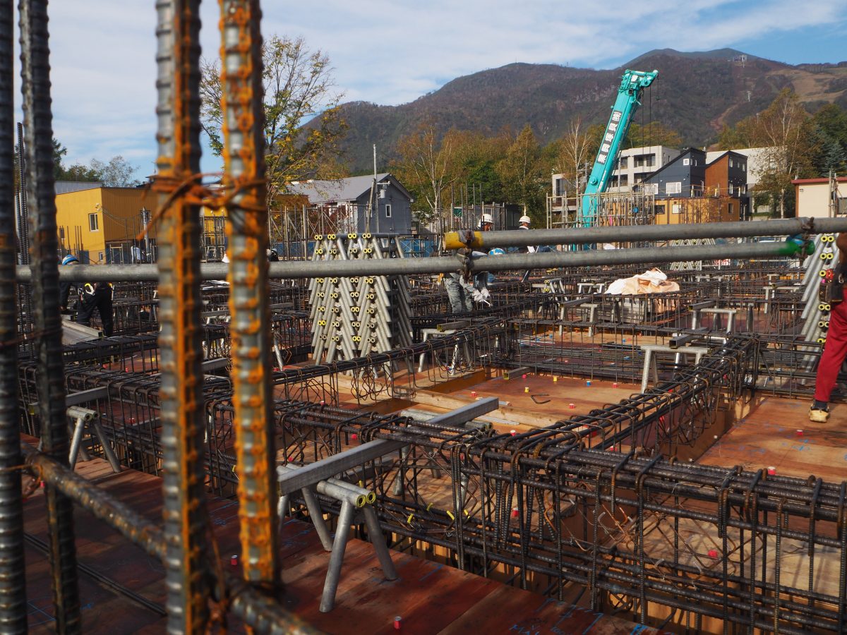 2日目は初めに「Onsen新築」の現場へお邪魔しました。こちらの現場では、地上2階建、鉄筋コンクリート造の温泉施設を建設しています。1階部分には飲食店が入る予定で、2階部分が公衆浴場となっており、外観の石積みが特徴的なデザインの建物です。視察当日は、2階部分の梁鉄筋を型枠内に収める梁落とし作業とスラブ配筋の作業が行われており、現場内では50名ほどの作業員の方々と連携しながら施工にあたる姿が見受けられました。継続的な開発・発展が進むニセコ地区においては、建設重機の手配や資材の納期、諸事項の確認にも時間を要します。また、札幌市内と比べ降雪のタイミングも早く降雪量も多いため、余裕を持った工程管理に加え、発注者との密なコミュニケーションが大切になるそうです。今後、年内には躯体工事を完了し、冬期間も中断することなく施工を進めると伺いました。安全管理や体調管理に気を付けて来年6月末の竣工を迎えていただきたいです。お忙しい中ご対応いただきありがとうございました。