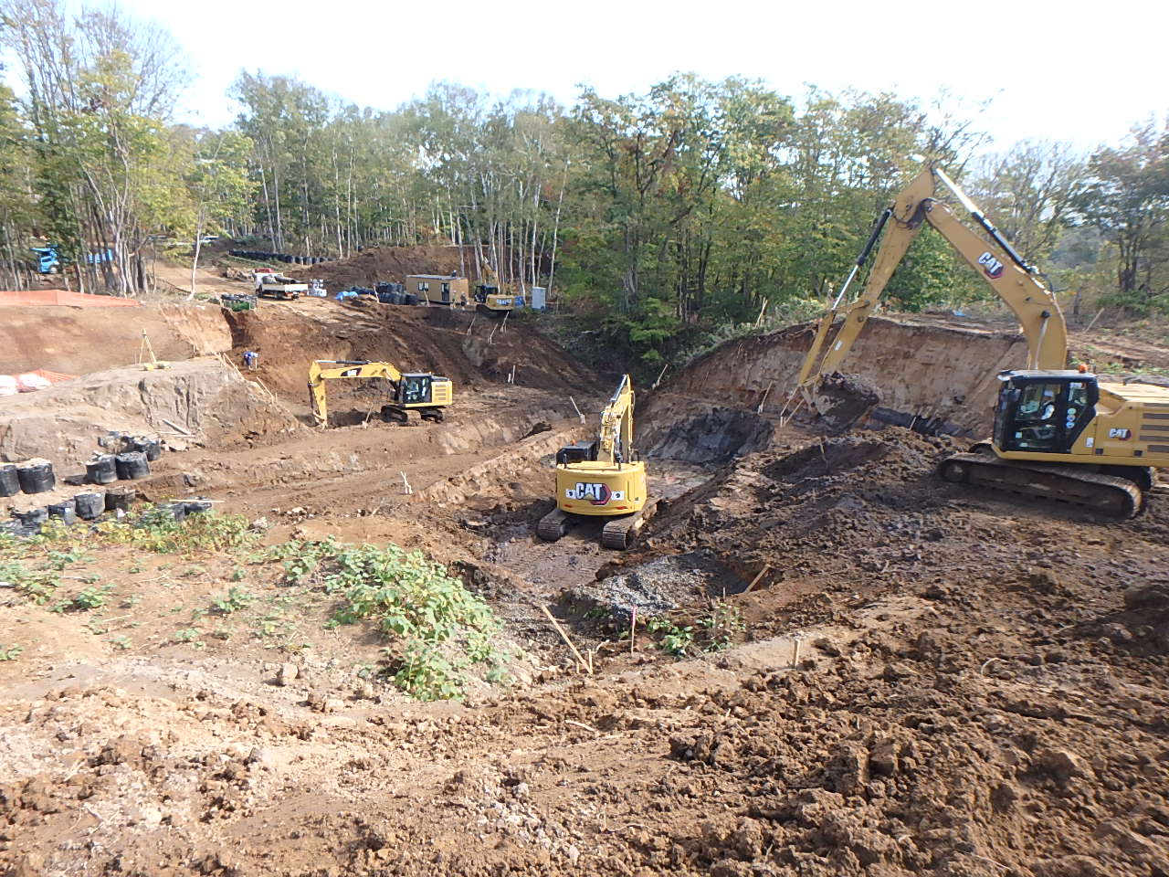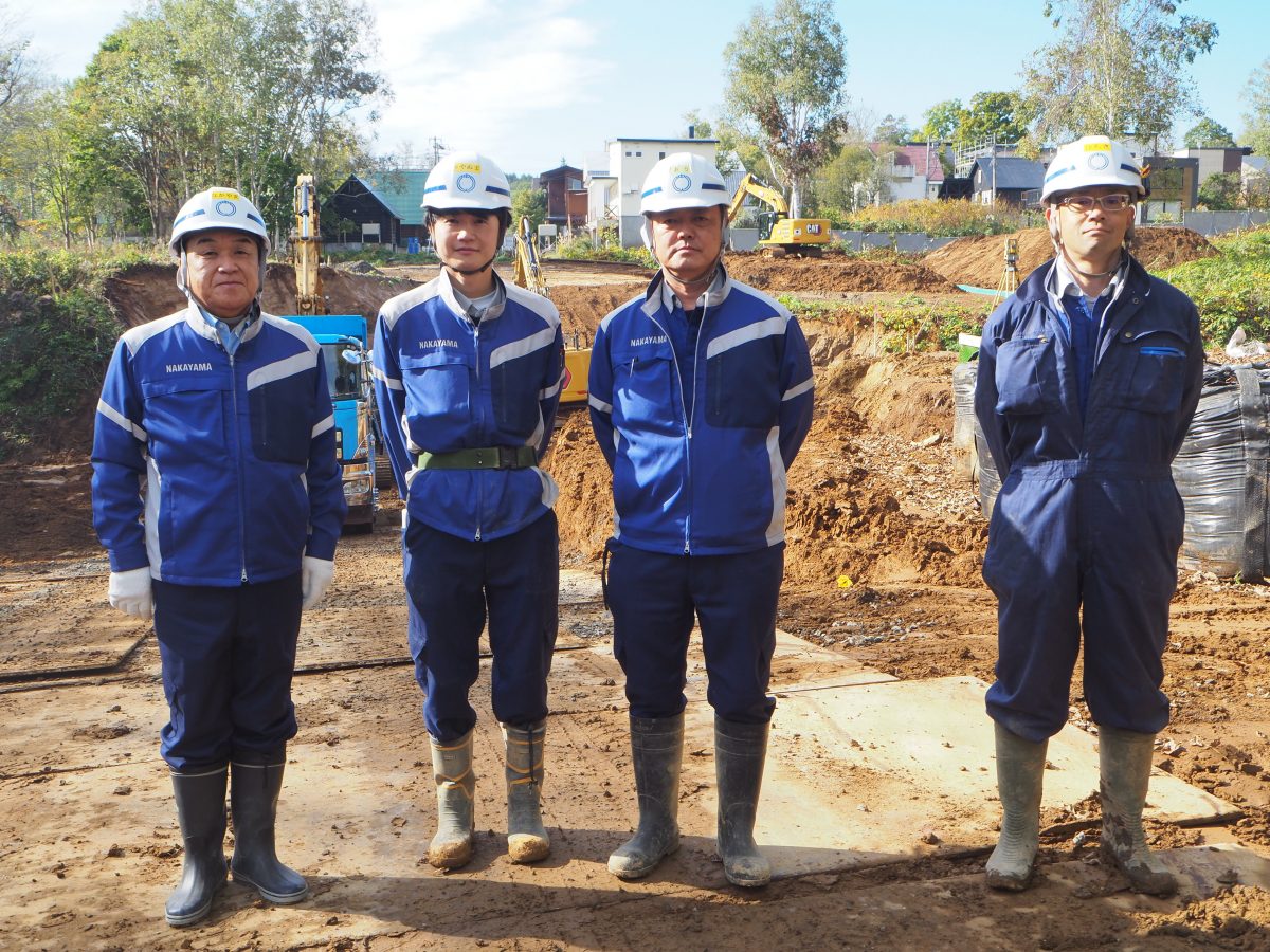 「ニセコひらふ造成」の現場です。造成と聞くと住宅地を想像する方も多いと思いますが、こちらの現場は別荘地の造成で、敷地内の道路と橋梁の施工を行っています。また、下水道工事や排水工事も併せて施工しており、今後は温泉設備の配管工事や電気工事も行うなど、そこに暮らす人たちの生活基盤を整える民間土木工事としては規模の大きな工事です。造成完了後は、羊蹄山が見える抜群の景観にコンドミニアムや管理棟、ショップ棟、テニスコートも建設される予定とのことです。当現場では、工事に伴う木々の伐採は必要最低限とし、自然景観を損なわないよう配慮する必要があり、草木の緑を残すために設計や施工方法を変更するなど予定通りに進まない難しさもあったようです。また、当該地域では地中に転石が多く埋没しているという特徴があり、その大きさは一般的な転石と比べても大きく処理するのが大変とのことですが、一部の転石は先に訪問した「Onsen新築工事」建物外観の石積み部分に再利用されることになっています。今後は積雪の関係による12月中下旬から4月中旬ごろまでの中断期間を経て、来年10月末の竣工に向けて施工を進めていきます。現場担当者の皆さんにおかれましては、お忙しい中丁寧に対応していただきありがとうございました。