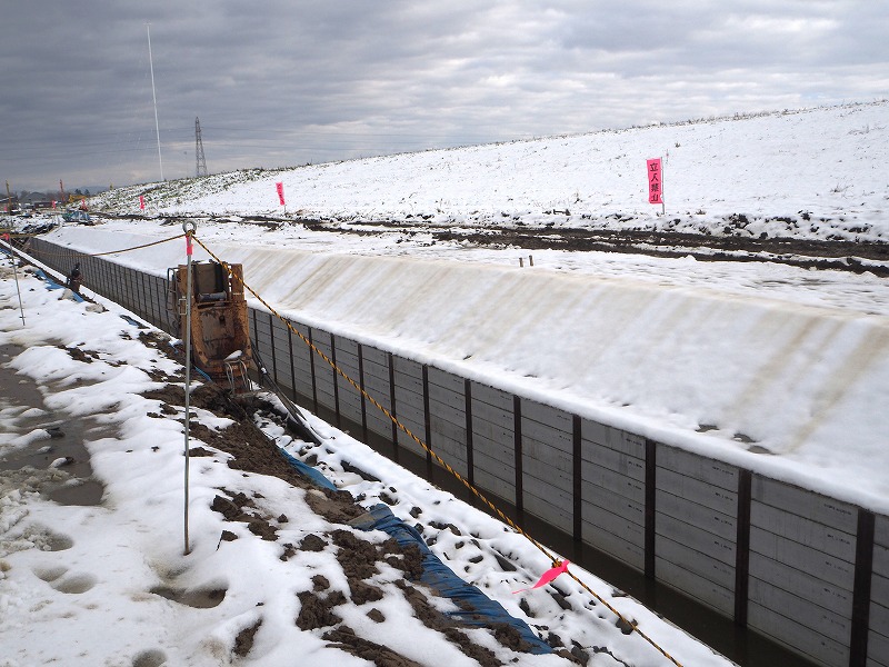 取材時には、矢板の打設や排水路が完了している部分、そして改修前の排水設備を見学させていただきました。現在の断面から4.7倍になるとのことで完成後がとても楽しみです。