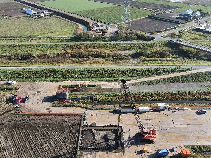 南九号川の河道拡幅に伴う橋梁改修工事が行われています。この工事は、南九号川の洪水や農地浸水などの災害を防止するための重要な取り組みです。近隣の橋台は、トレーラーなどの特殊車両の重量に対応していないため、設計変更が必要となり、迂回路工や仮橋工の追加もありました。そのため工種が多く、工程調整が非常に難しい状況です。また、施工箇所付近には長沼町や由仁町への送水している水道本管があり、振動が少しでも発生すると長沼町および由仁町全域の水道が濁る恐れがあるため、十分な注意を払って作業が進められているようです。